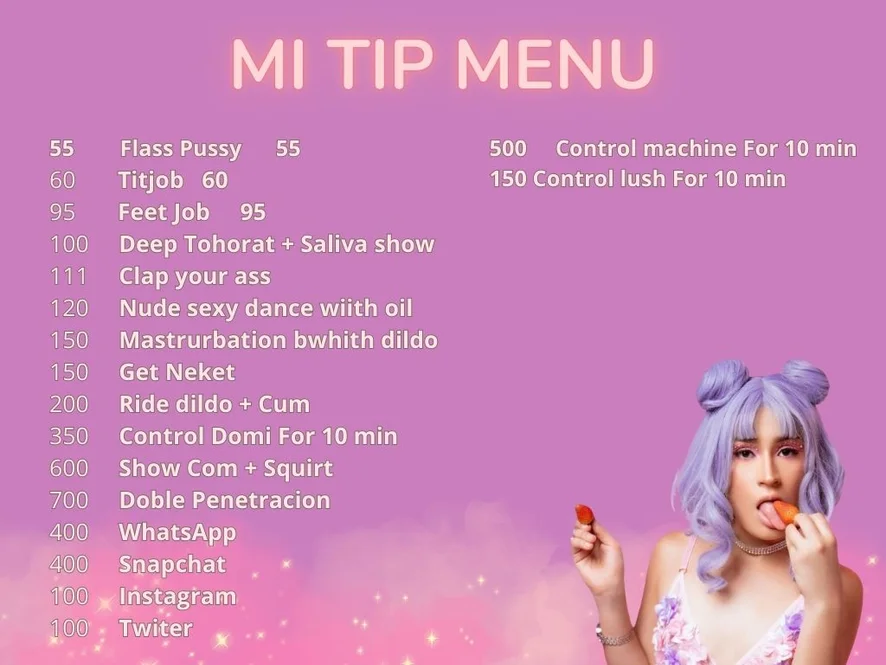 Ahegao, Yoga, Spettacolo con olio, Sborrata in faccia, Pecorina, Zoccolo di cammello, Cucina, Ditalino, Linguaggio esplicito, Doccia, Feticismo dei piedi, Umiliazione, Gola profonda, Giocattoli erotici, Tacchi, Donna sopra, Spogliarello, Anale, Squirt, Hardcore, Orgasmo, Doppia Penetrazione, Dildo o Vibratore, Ballo erotico, Cosplay